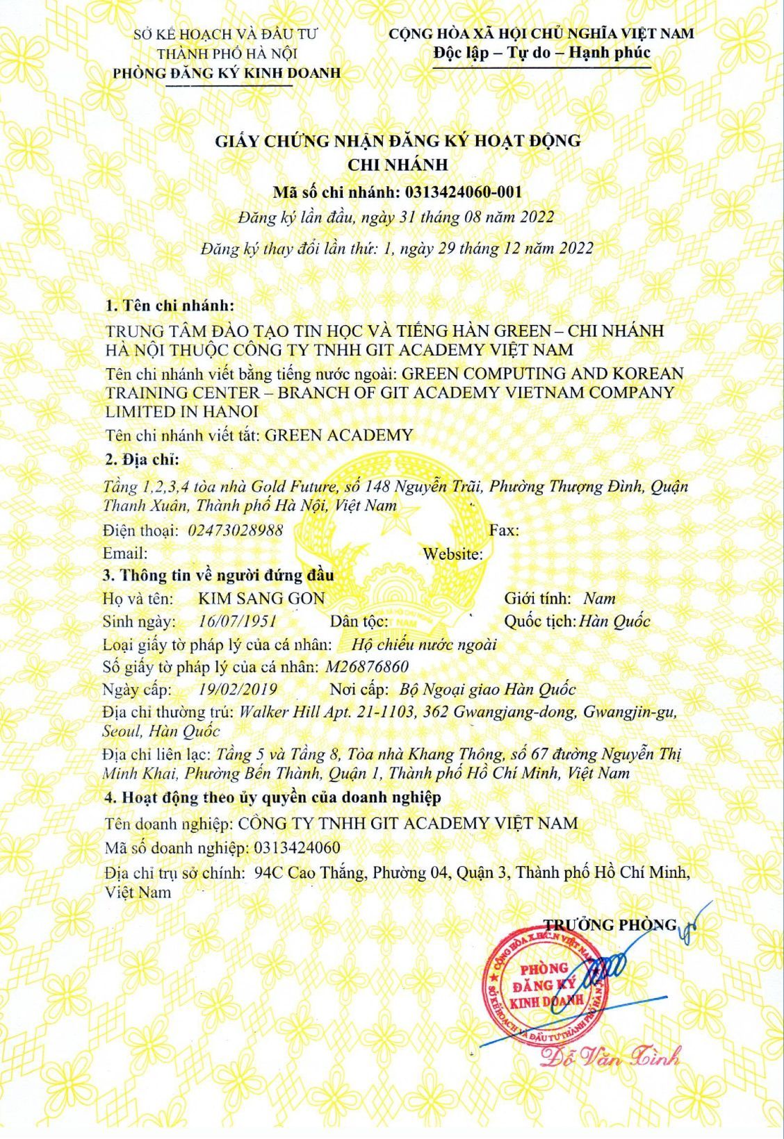 chứng nhận đăng ký hoạt động chi nhánh
